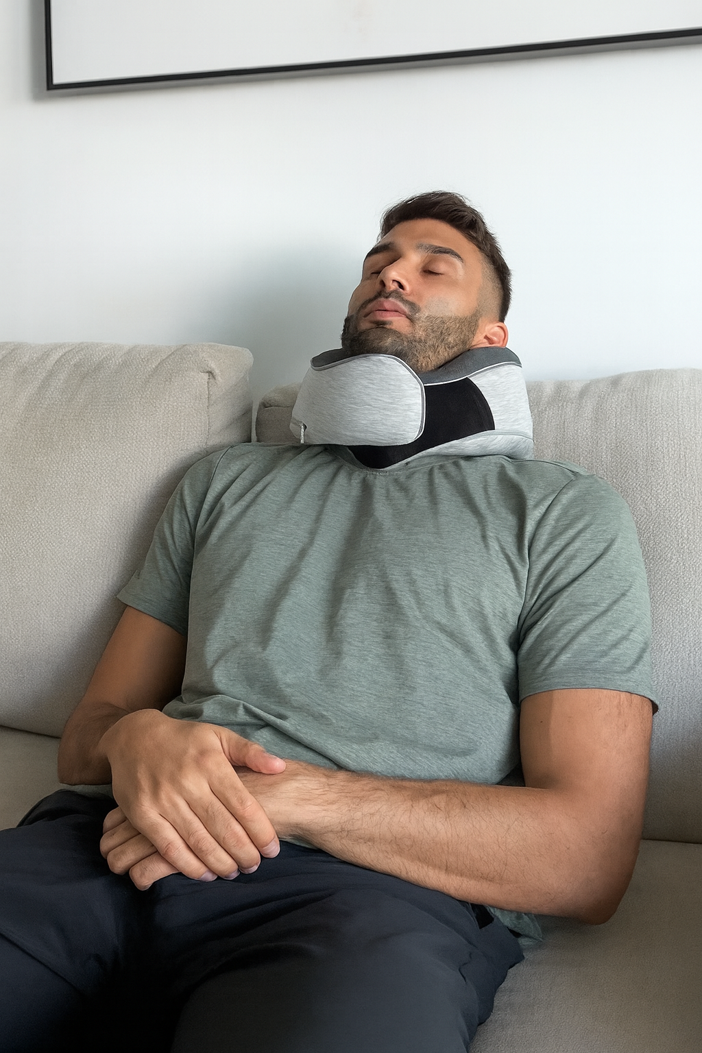 Recent testing reveals that 91% of traditional travel pillows fail at their one job. When you drift off, your head flops to the side—stretching one side of your neck, compressing the other. Ten pounds of dead weight, unsupported. For hours.😞